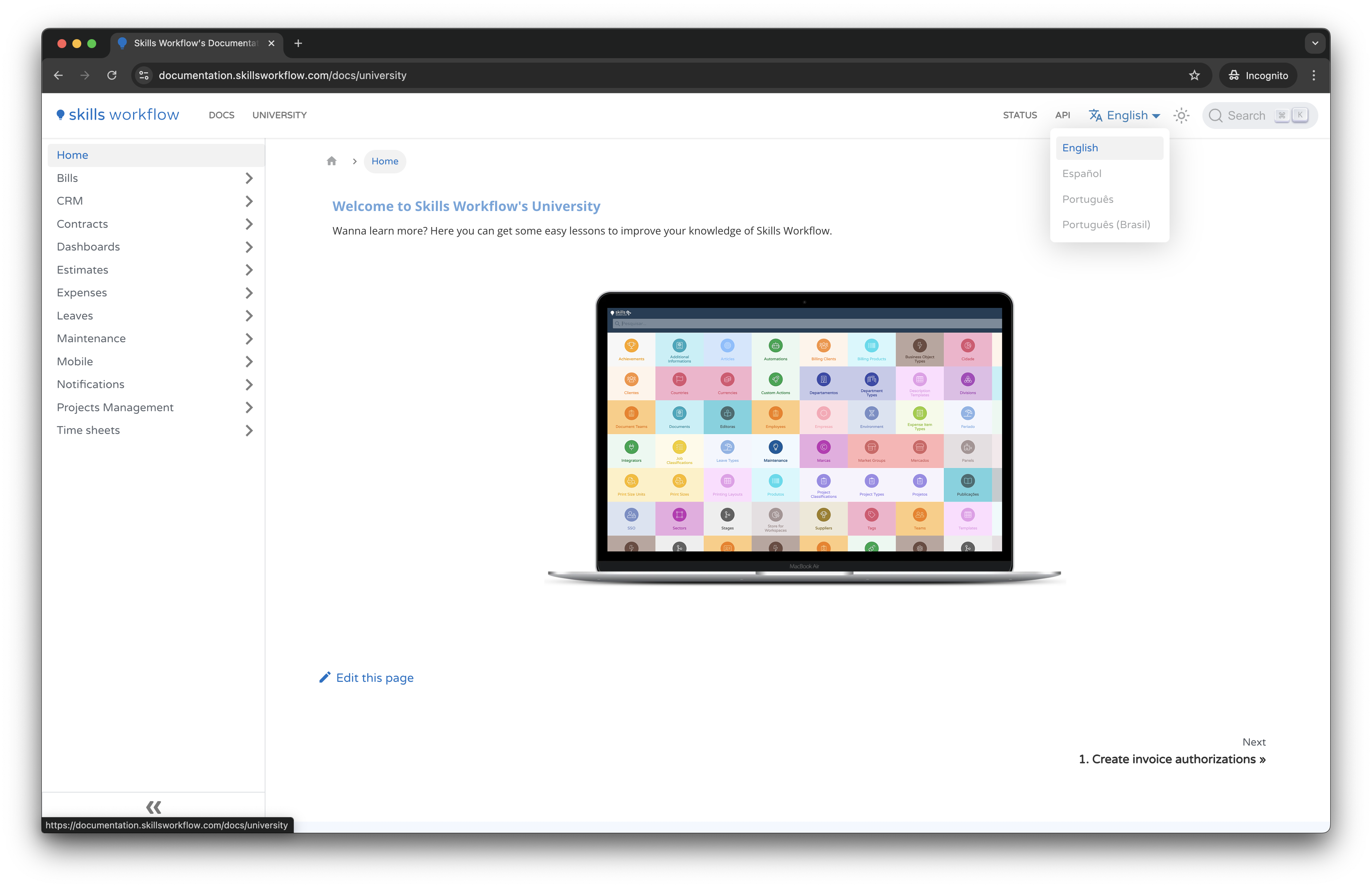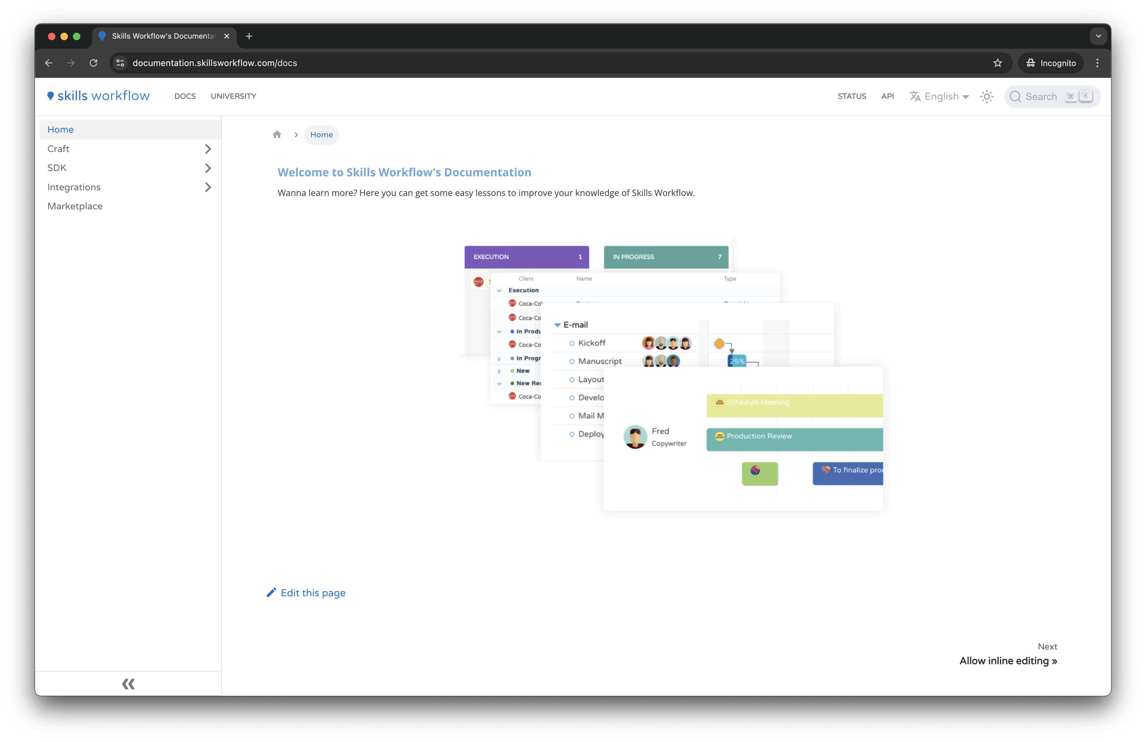 The Skills Workflow Documentation Website offers a clear and organized resource for users to access product information, guides, and technical references. Built with Docusaurus, it features a fast and accurate Algolia search, multi-language support, and is continuously deployed via Netlify. Content is managed through a GitHub repository, ensuring version control and collaborative updates.